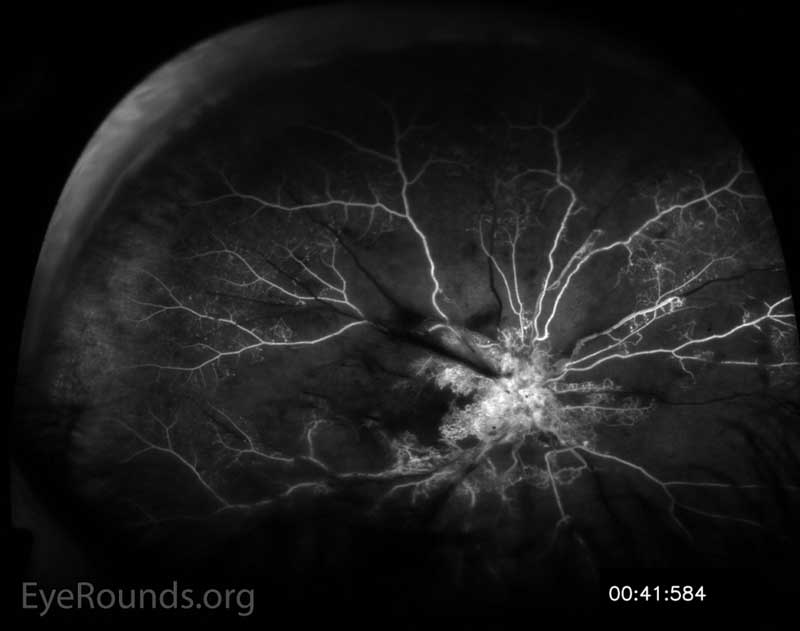 This patient is a 32-year-old female with poorly controlled type I diabetes mellitus and severe proliferative diabetic retinopathy. She had not had panretinal photocoagulation at the time of presentation. Eventually this patient developed severe vitreous hemorrhage and traction retinal detachments in both eyes. Optos® widefield fluorescein angiography demonstrates delayed arteriovenous transit time, extensive neovascularization of the disc and huge areas of capillary nonperfusion.