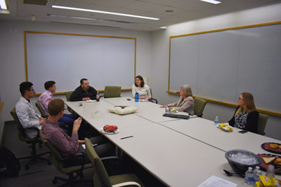 Pictured from left to right: Arlene Drack, MD; student employees Elliot Stalter, Jacintha Thomas, and Aishwarya Kothapalli, and Wanda Pfeifer, OC(C), COMT.