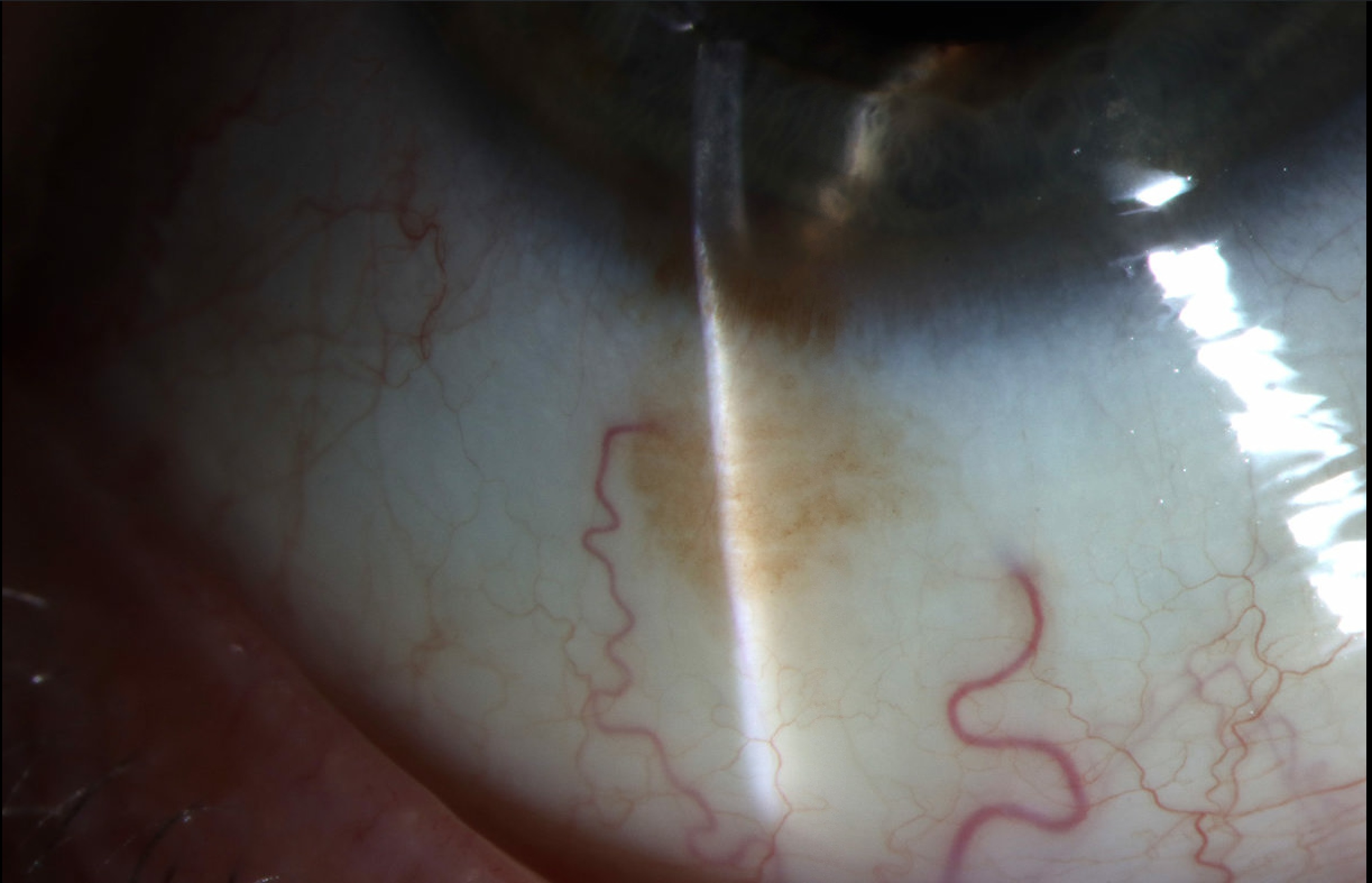 Slit lamp photos of the right eye from a 66-year-old Caucasian man with one clock hour of flat brown pigmented conjunctival tissue at the inferior bulbar quadrant that extends into the limbus. No feeder vessels were identified. Gonioscopy showed no evidence of ciliary body tumor. The patient first noticed this spot two weeks prior to presentation. These findings were consistent with primary acquired melanosis (PAM). Two small iris nevi were also seen inferiorly, above the area of PAM. A small lower lid margin nevus measuring 1.5 mm was identified nasally on the same eye. As no concerning features were identified on examination, annual surveillance including repeat slit lamp photography was advised to monitor for progression.