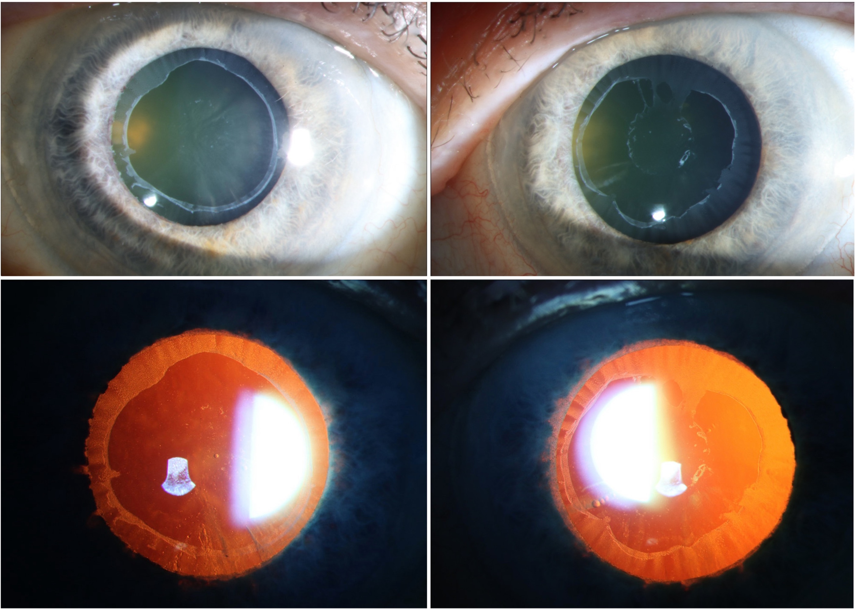 Pseudoexfoliation (PXF) syndrome is a condition in which fibrillar material is deposited in the anterior segment of the eye and other places throughout the body. It has complex inheritance, but is almost always associated with mutations in the LOXL1 gene. Individuals with this condition classically have exfoliative material visible along the pupillary margin and on the anterior lens capsule. The material on the lens capsule is often has a target-like appearance with distribution peripherally and centrally and an intervening clear space in the mid-periphery, presumably because the iris rubs the material off in this location as the pupil changes size. Other findings include "brown sugar" pigment in the trabecular meshwork, "moth-eaten" transillumination defects along the pupillary margin, and potentially zonular laxity which can lead to lens subluxation. It may be associated with open-angle glaucoma if the fibrillar material obstructs the trabecular meshwork and causes elevated intraocular pressure.